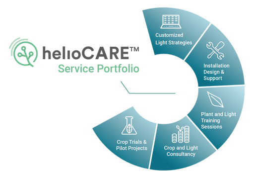 Tjänster som nu kommer att omfattas under helioCARE™ inkluderar: ljusanalyser, ljusplanering och anpassade ljusstrategier, installationsdesign och installationssupport, utbildningar inom växt och ljus optimering för odling, växt- och ljuskonsultationer samt kommersiell växtforskning och pilotprojekt.