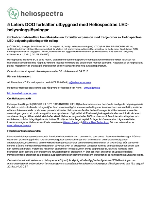 (GÖTEBORG, Sverige / SAN FRANCISCO, CA, augusti 13, 2018) – Heliospectra AB (publ) (OTCQB: HLSPY, FIRSTNORTH: HELIO), världsledande inom intelligent belysningsteknik för växthus och kontrollerade odlingsmiljöer, meddelar en tredje order från 5 Leters DOO. Företaget fortsätter sin utbyggnad i Resen, Makedonien och lägger därmed en ny order på Heliospectras EOS-serie LED-belysning. Ordervärdet är 1,6 Mkr (USD 179 760 USD).