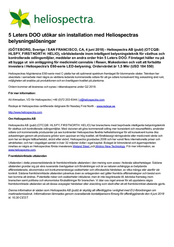 (GÖTEBORG, Sverige / SAN FRANCISCO, CA, 4 juni 2018) – Heliospectra AB (publ) (OTCQB: HLSPY, FIRSTNORTH: HELIO), världsledande inom intelligent belysningsteknik för växthus och kontrollerade odlingsmiljöer, meddelar en andra order från 5 Leters DOO. Företaget håller nu på att bygga ut  sin anläggning för medicinskt cannabis i Resen, Makedonien och valt att fortsätta investera i Heliospectra’s E60-serie LED-belysning. Ordervärdet är 1,5 Mkr (USD 184 550)