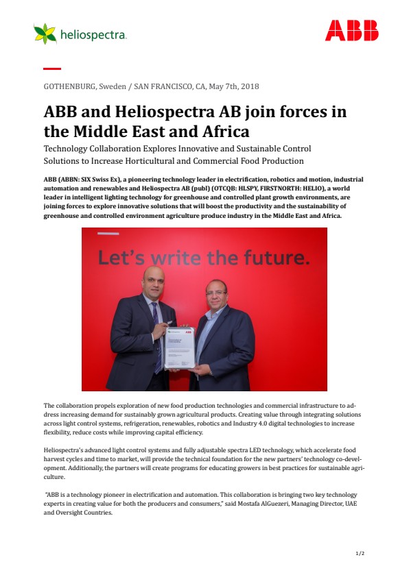 GOTHENBURG, Sweden / SAN FRANCISCO, CA, May 7, 2018 – ABB (ABBN: SIX Swiss Ex), a pioneering technology leader in electrification, robotics and motion, industrial automation and renewables and Heliospectra AB (publ) (OTCQB: HLSPY, FIRSTNORTH: HELIO), a world leader in intelligent lighting technology for greenhouse and controlled plant growth environments, are joining forces to explore innovative solutions that will boost the productivity and the sustainability of greenhouse and controlled environment agriculture produce industry in the Middle East and Africa.