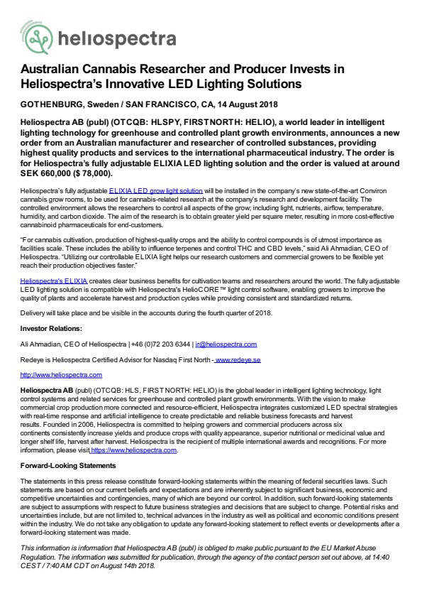 Heliospectra AB (publ) (OTCQB: HLSPY, FIRSTNORTH: HELIO), a world leader in intelligent lighting technology for greenhouse and controlled plant growth environments, announces a new order from an Australian manufacturer and researcher of controlled substances, providing highest quality products and services to the international pharmaceutical industry. The order is for Heliospectra’s fully adjustable ELIXIA LED lighting solution and the order is valued at around SEK 660,000 ($ 78,000).