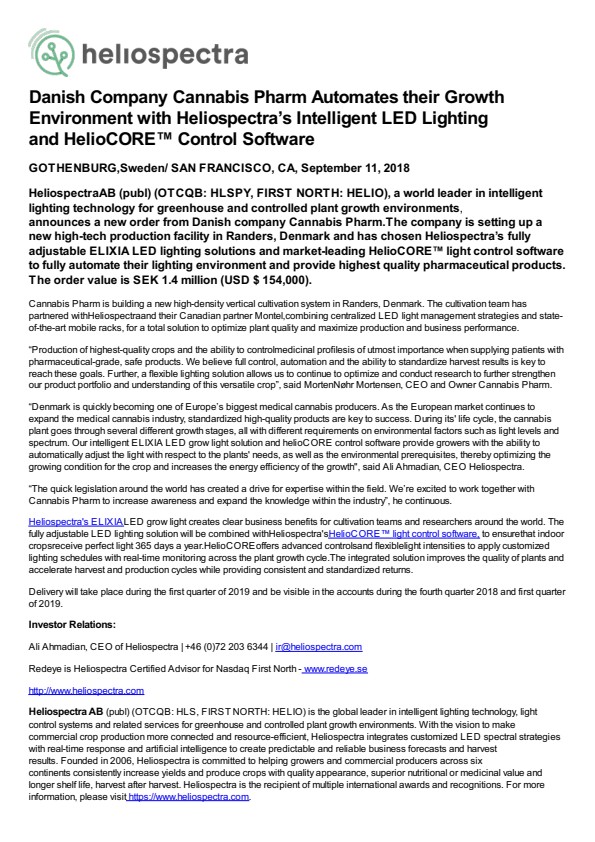 Heliospectra AB (publ) (OTCQB: HLSPY, FIRST NORTH: HELIO), a world leader in intelligent lighting technology for greenhouse and controlled plant growth environments, announces a new order from Danish company Cannabis Pharm. The company is setting up a new high-tech production facility in Randers, Denmark and has chosen Heliospectra’s fully adjustable ELIXIA LED lighting solutions and market-leading HelioCORE™ light control software to fully automate their lighting environment and provide highest quality pharmaceutical products. The order value is SEK 1.4 million (USD $ 154,000).