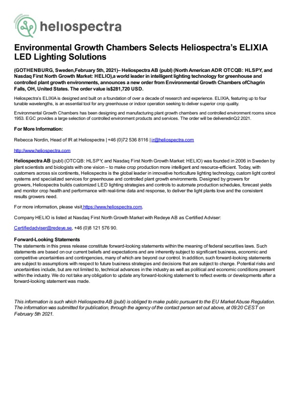 (GOTHENBURG, Sweden, February 5th, 2021)– Heliospectra AB (publ) (North American ADR OTCQB: HLSPY, and Nasdaq First North Growth Market: HELIO), a world leader in intelligent lighting technology for greenhouse and controlled plant growth environments, announces a new order from Environmental Growth Chambers of Chagrin Falls, OH, United States. The order value is $281,720 USD.