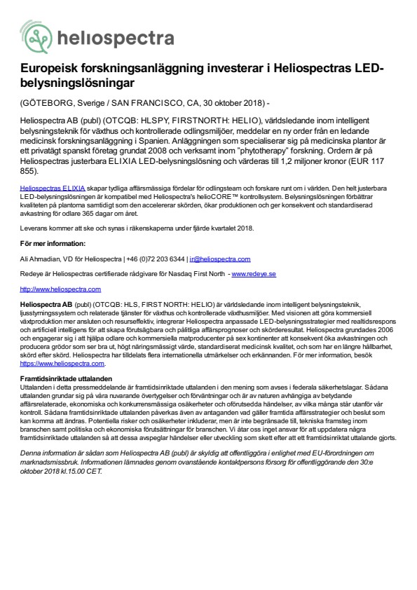 Heliospectra AB (publ) (OTCQB: HLSPY, FIRSTNORTH: HELIO), världsledande inom intelligent belysningsteknik för växthus och kontrollerade odlingsmiljöer, meddelar en ny order från en ledande medicinsk forskningsanläggning i Spanien. Anläggningen som specialiserar sig på medicinska plantor är ett privatägt spanskt företag grundat 2008 och verksamt inom ”phytotherapy” forskning. Ordern är på Heliospectras justerbara ELIXIA LED-belysningslösning och värderas till 1,2 miljoner kronor (EUR 117 855).