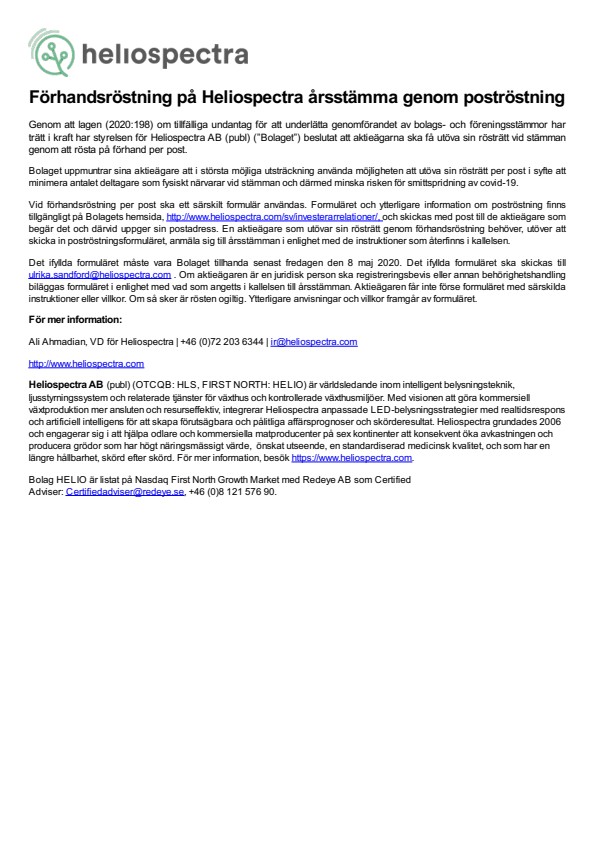 Vid förhandsröstning per post ska ett särskilt formulär användas. Formuläret och ytterligare information om poströstning finns tillgängligt på Bolagets hemsida, http://www.heliospectra.com/sv/investerarrelationer/, och skickas med post till de aktieägare som begär det och därvid uppger sin postadress. En aktieägare som utövar sin rösträtt genom förhandsröstning behöver, utöver att skicka in poströstningsformuläret, anmäla sig till årsstämman i enlighet med de instruktioner som återfinns i kallelsen.