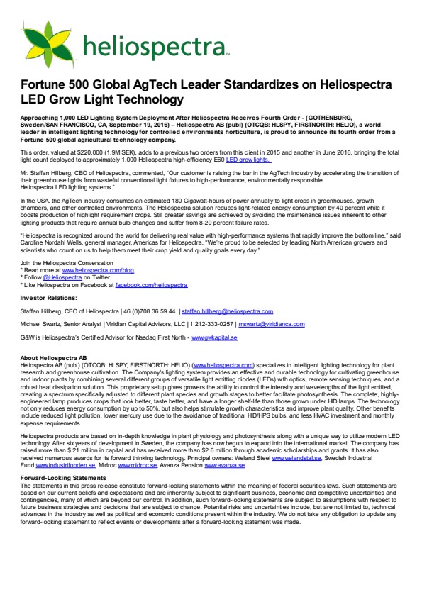 Mr. Staffan Hillberg, CEO of Heliospectra, commented, “Our customer is raising the bar in the AgTech industry by accelerating the transition of their greenhouse lights from wasteful conventional light fixtures to high-performance, environmentally responsible Heliospectra LED lighting systems.”