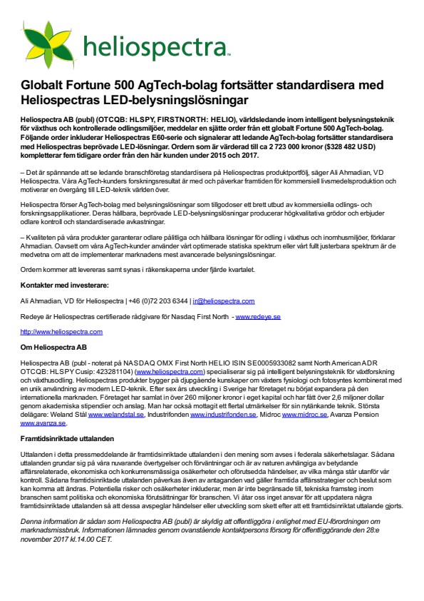 – Det är spännande att se ledande branschföretag standardisera på Heliospectras produktportfölj, säger Ali Ahmadian, VD Heliospectra. Våra AgTech-kunders forskningsresultat är med och påverkar framtiden för kommersiell livsmedelsproduktion och motiverar en övergång till LED-teknik världen över.