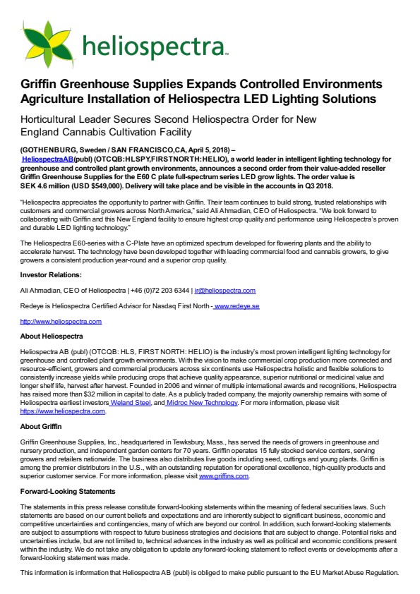 (GOTHENBURG, Sweden / SAN FRANCISCO, CA, April 5, 2018) – Heliospectra AB (https://www.heliospectra.com/) (https://www.heliospectra.com/)(publ) (OTCQB: HLSPY, FIRSTNORTH: HELIO), a world leader in intelligent lighting technology for greenhouse and controlled plant growth environments, announces a second order from their value-added reseller Griffin Greenhouse Supplies for the E60 C plate full-spectrum series LED grow lights. The order value is SEK 4.6 million (USD $549,000). Delivery will take place and be visible in the accounts in Q3 2018.