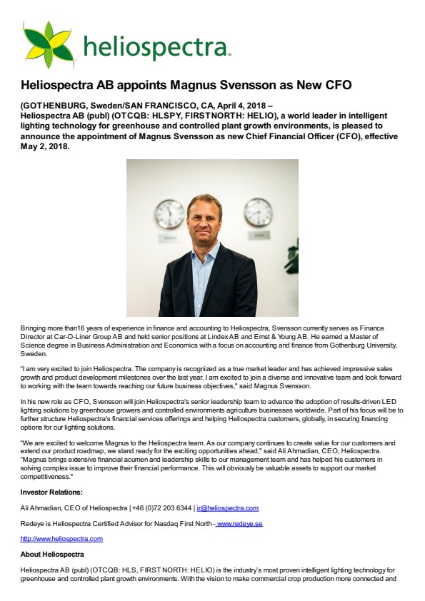 Heliospectra AB (publ) (OTCQB: HLSPY, FIRSTNORTH: HELIO), a world leader in intelligent lighting technology for greenhouse and controlled plant growth environments, is pleased to announce the appointment of Magnus Svensson as new Chief Financial Officer (CFO), effective May 2, 2018.