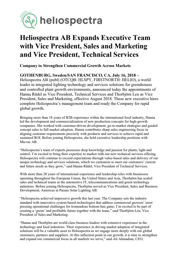 GOTHENBURG, Sweden/SAN FRANCISCO, CA, July 16, 2018 – Heliospectra AB (publ) (OTCQB: HLSPY, FIRSTNORTH: HELIO), a world leader in integrated lighting technology and services solutions for greenhouses and controlled plant growth environments, announced today the appointments of Hanna Rüdel as Vice President, Technical Services and Thorbjörn Leu as Vice President, Sales and Marketing, effective August 2018. These new executive hires complete Heliospectra’s management team and ready the Company for rapid global growth.