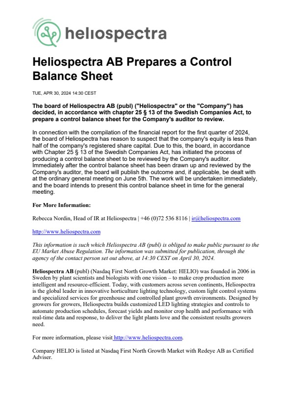 In connection with the compilation of the financial report for the first quarter of 2024, the board of Heliospectra has reason to suspect that the company’s equity is less than half of the company’s registered share capital. Due to this, the board, in accordance with Chapter 25 § 13 of the Swedish Companies Act, has initiated the process of producing a control balance sheet to be reviewed by the Company’s auditor. Immediately after the control balance sheet has been drawn up and reviewed by the Company’s auditor, the board will publish the outcome and, if applicable, be dealt with at the ordinary general meeting on June 5th. The work will be undertaken immediately, and the board intends to present this control balance sheet in time for the general meeting.