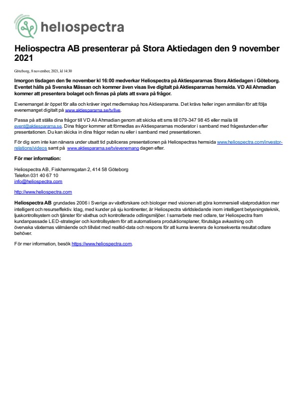 Imorgon tisdagen den 9e november kl 16:00 medverkar Heliospectra på Aktiespararnas Stora Aktiedagen i Göteborg. Eventet hålls på Svenska Mässan och kommer även visas live digitalt på Aktiespararnas hemsida. VD Ali Ahmadian kommer att presentera bolaget och finnas på plats att svara på frågor.
