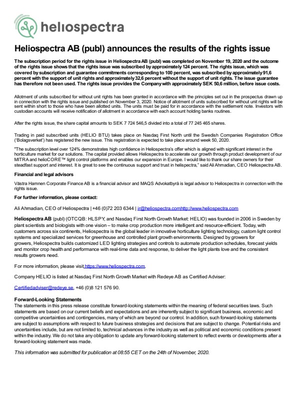 “The subscription level over 124% demonstrates high confidence in Heliospectra’s offer which is aligned with significant interest in the horticulture market for our solutions. The capital provided allows Heliospectra to accelerate our growth through product development of our MITRA and helioCORE™ light control platforms and enables our expansion in Europe. I would like to thank our share owners for their steadfast support and interest. It is great to see the continuous support and trust in helispectra,” said Ali Ahmadian, CEO Heliospectra AB.