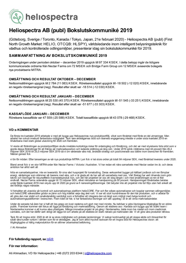 (Göteborg, Sverige / Toronto, Kanada / Tokyo, Japan, 21e februari 2020) – Heliospectra AB (publ) (First North Growth Market: HELIO, OTCQB: HLSPY), världsledande inom intelligent belysningsteknik för växthus och kontrollerade odlingsmiljöer, presenterar idag sin bokslutskommuniké för 2019.
