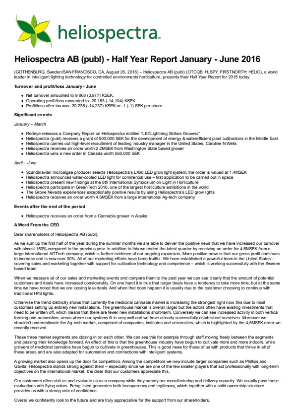 - Heliospectra receives an order worth 2.2MSEK from Washington State based grower