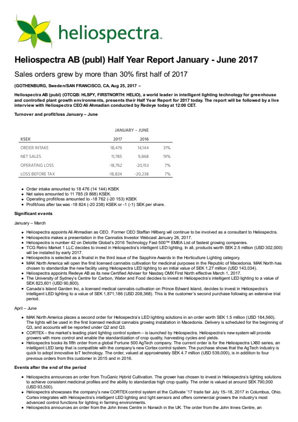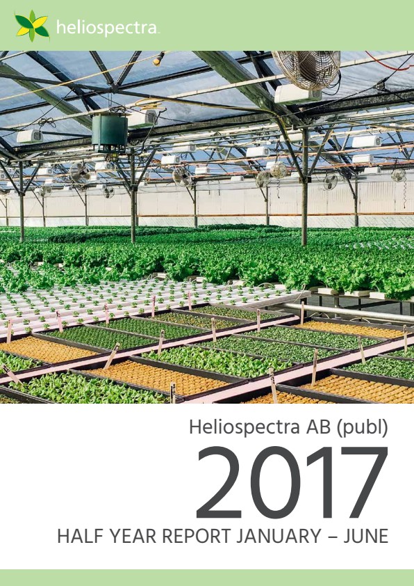 Heliospectra AB (publ) (OTCQB: HLSPY, FIRSTNORTH: HELIO), a world leader in intelligent lighting technology for greenhouse and controlled plant growth environments, presents their Half Year Report for 2017 today. The report will be followed by a live interview with Heliospectra CEO Ali Ahmadian conducted by Redeye today at 12:00 CET.