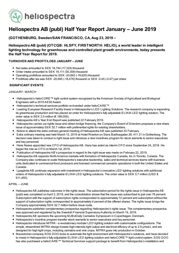 Heliospectra AB (publ) (OTCQB: HLSPY, FIRSTNORTH: HELIO), a world leader in intelligent lighting technology for greenhouse and controlled plant growth environments, today presents the Half Year Report for 2019.