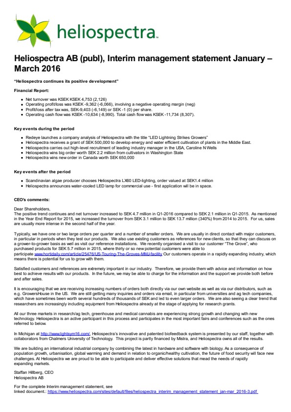 For the complete Interim management statement, see linked document.: https://www.heliospectra.com/sites/default/files/heliospectra_interim_management_statement_jan-mar_2016-3.pdf