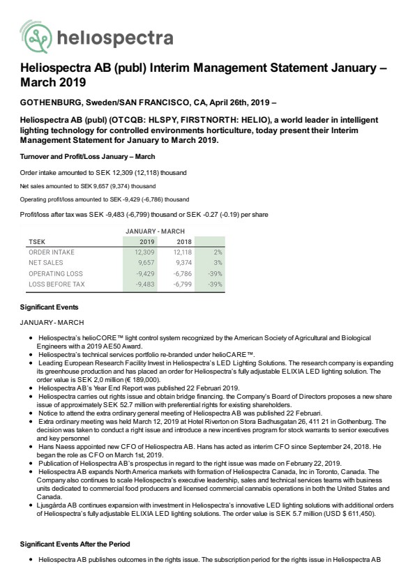 Heliospectra AB (publ) (OTCQB: HLSPY, FIRSTNORTH: HELIO), a world leader in intelligent lighting technology for controlled environments horticulture, today present their Interim Management Statement for January to March 2019.