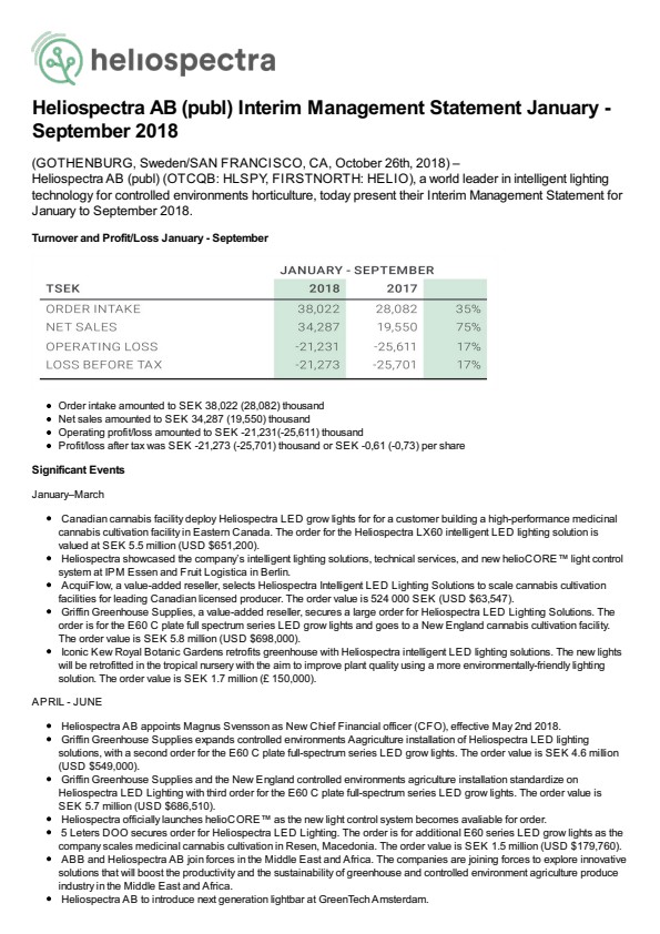 Heliospectra AB (publ) (OTCQB: HLSPY, FIRSTNORTH: HELIO), a world leader in intelligent lighting technology for controlled environments horticulture, today present their Interim Management Statement for January to September 2018.