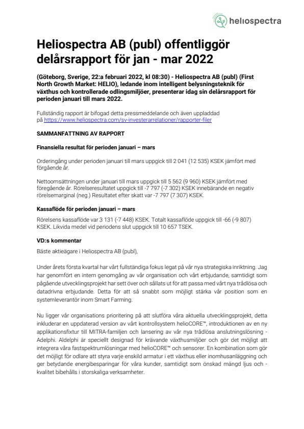 Inledningen av 2022 har präglats av stor geopolitisk oro och ekonomisk osäkerhet, bland annat på grund av höga energipriser och störningar i den globala leveranskedjan. Faktorer som fortsätter att påverka investeringsnivån på belysningssystem inom odlingsnäringen negativt. Som ett resultat ligger vår orderingång och nettoförsäljning fortfarande långt under önskad nivå. Men behovet av energibesparande lösningar för att producera grönsaker av hög kvalitet har aldrig varit så stort. Heliospectra kommer att vara mycket väl positionerat för att leverera den nödvändiga lösningen till våra kunder så att de kan producera på ett mer hållbart sätt året runt och med mer kontroll per m2.