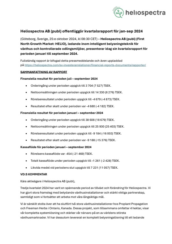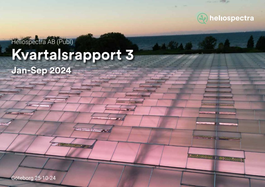 Tredje kvartalet 2024 har varit en spännande period av tillväxt och förändring för Heliospectra. Vi har gjort stora framsteg med betydande växthusinstallationer och stärkt viktiga partnerskap, samtidigt som vi fortsätter att arbeta mot våra långsiktiga mål.
