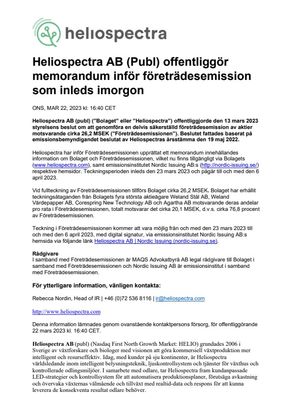 Heliospectra har inför Företrädesemissionen upprättat ett memorandum innehållandes information om Bolaget och Företrädesemissionen, vilket nu finns tillgängligt via Bolagets (www.heliospectra.com), samt emissionsinstitutet Nordic Issuing AB:s (https://nordic-issuing.se/) respektive hemsidor. Teckningsperioden inleds den 23 mars 2023 och pågår till och med den 6 april 2023.