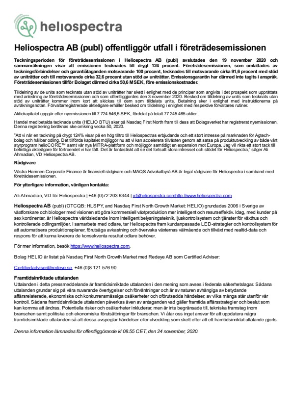 ”Att vi når en teckning på drygt 124% visar på en hög tilltro till Heliospectras erbjudande och ett stort intresse på marknaden för Agtech-bolag och hållbar odling. Det tillförda kapitalet möjliggör nu att vi kan accelerera tillväxten genom att satsa på produktutveckling av både vårt styrprogram helioCORE™ samt vår nya MITRA-plattform och möjliggör samtidigt en expansion mot Europa. Jag vill rikta ett stort tack till befintliga aktieägare för förtroendet vi har fått. Det är fantastiskt att se det fortsatt stora intresset och stödet för Heliospectra,” säger Ali Ahmadian, VD Heliospectra AB.