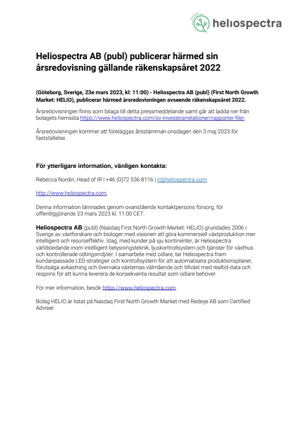 (Göteborg, Sverige, 23e mars 2023, kl: 11:00) – Heliospectra AB (publ) (First North Growth Market: HELIO), publicerar härmed årsredovisningen avseende räkenskapsåret 2022.