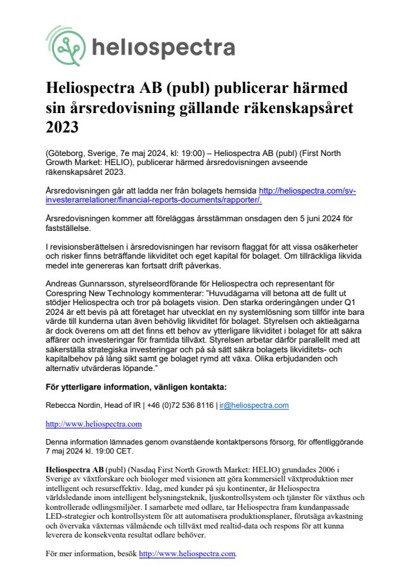 Årsredovisningen går att ladda ner från bolagets hemsida https://heliospectra.com/sv-investerarrelationer/financial-reports-documents/rapporter/.