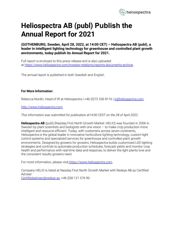 (GOTHENBURG, Sweden, April 28, 2022, at 14:00 CET) – Heliospectra AB (publ), a leader in intelligent lighting technology for greenhouse and controlled plant growth environments, today publish its Annual Report for 2021.