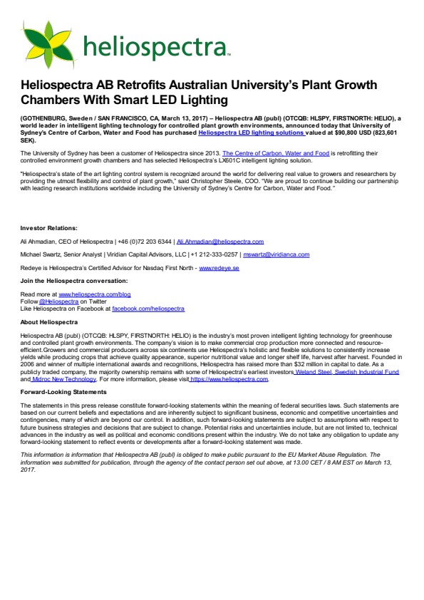 (GOTHENBURG, Sweden / SAN FRANCISCO, CA, March 13, 2017) – Heliospectra AB (publ) (OTCQB: HLSPY, FIRSTNORTH: HELIO), a world leader in intelligent lighting technology for controlled plant growth environments, announced today that University of Sydney’s Centre of Carbon, Water and Food has purchased Heliospectra LED lighting solutions (https://www.heliospectra.com/led-grow-lights-applications) (https://www.heliospectra.com/led-grow-lights-applications)valued at $90,800 USD (823,601 SEK).