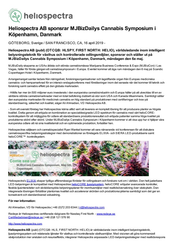 Heliospectra AB (publ) (OTCQB: HLSPY, FIRST NORTH: HELIO), världsledande inom intelligent belysningsteknik för växthus och kontrollerade odlingsmiljöer, sponsrar och ställer ut på MJBizDailys Cannabis Symposium i Köpenhamn, Danmark, måndagen den 6e maj.