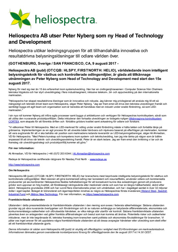 Heliospectra AB (publ) (OTCQB: HLSPY, FIRSTNORTH: HELIO), världsledande inom intelligent belysningsteknik för växthus och kontrollerade odlingsmiljöer, är glada att tillkännage utnämningen av Peter Nyberg som Head of Technology and Development med start den 15e augusti 2017.
