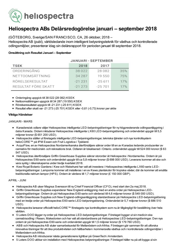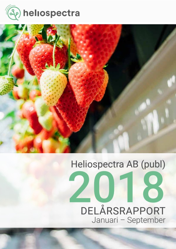 Heliospectra AB (publ), världsledande inom intelligent belysningsteknik för växthus och kontrollerade odlingsmiljöer, presenterar idag sin delårsrapport för perioden januari till september 2018.