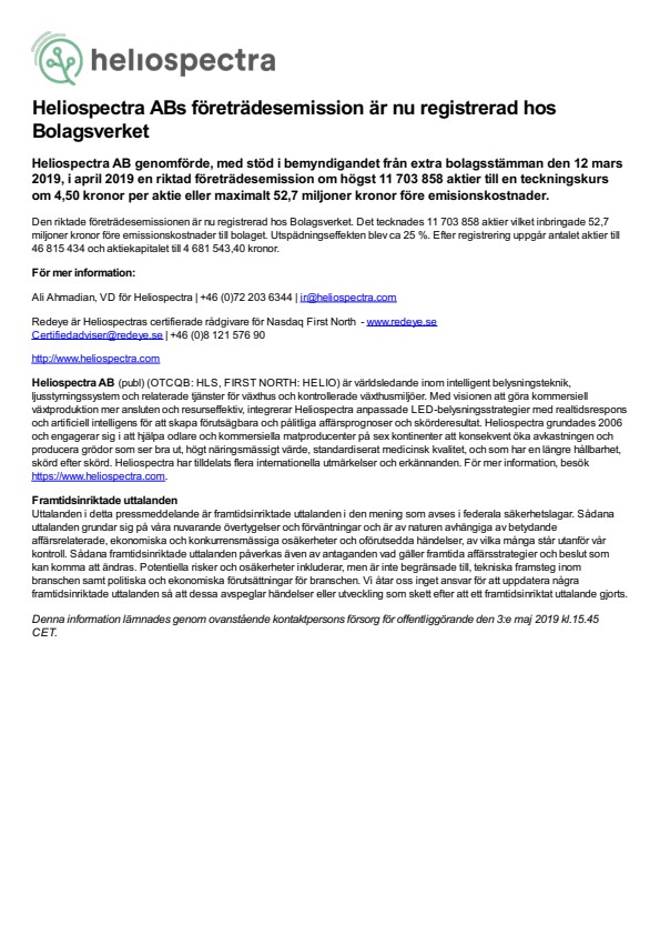 Heliospectra AB genomförde, med stöd i bemyndigandet från extra bolagsstämman den 12 mars 2019, i april 2019 en riktad företrädesemission om högst 11 703 858 aktier till en teckningskurs om 4,50 kronor per aktie eller maximalt 52,7 miljoner kronor före emisionskostnader.