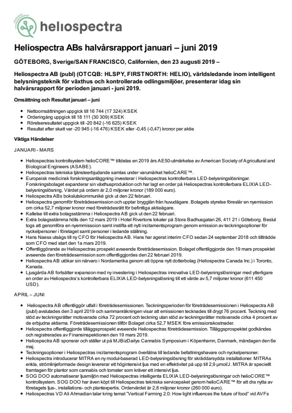 Heliospectra AB (publ) (OTCQB: HLSPY, FIRSTNORTH: HELIO), världsledande inom intelligent belysningsteknik för växthus och kontrollerade odlingsmiljöer, presenterar idag sin halvårsrapport för perioden januari – juni 2019.