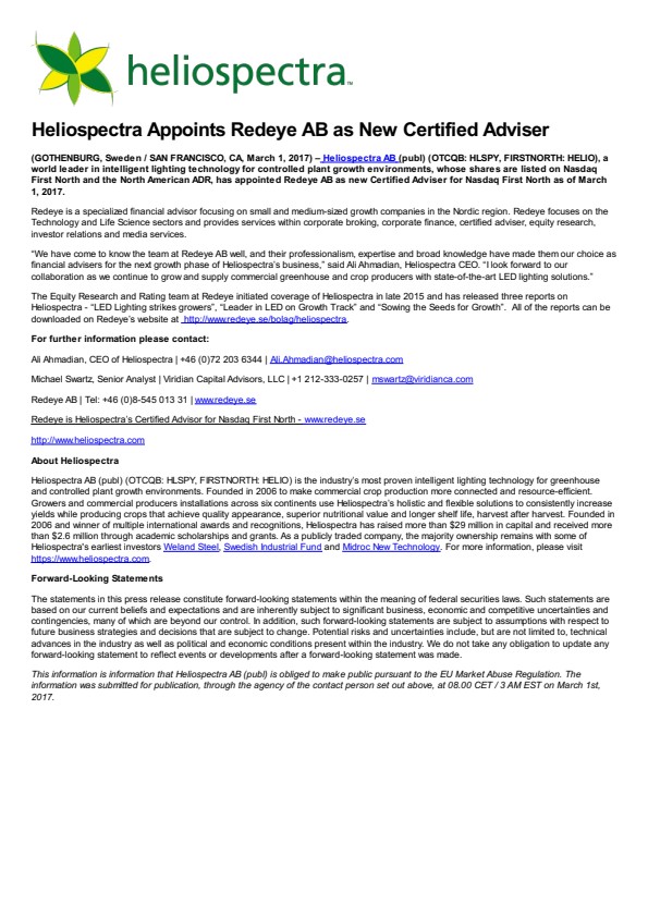 “We have come to know the team at Redeye AB well, and their professionalism, expertise and broad knowledge have made them our choice as financial advisers for the next growth phase of Heliospectra’s business,” said Ali Ahmadian, Heliospectra CEO. “I look forward to our collaboration as we continue to grow and supply commercial greenhouse and crop producers with state-of-the-art LED lighting solutions.”