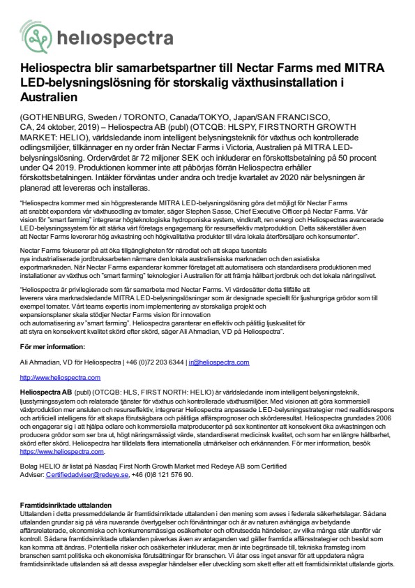 (GOTHENBURG, Sweden / TORONTO, Canada / TOKYO, Japan / SAN FRANCISCO, CA, 24 oktober, 2019) – Heliospectra AB (publ) (OTCQB: HLSPY, FIRSTNORTH GROWTH MARKET: HELIO), världsledande inom intelligent belysningsteknik för växthus och kontrollerade odlingsmiljöer, tillkännager en ny order från Nectar Farms i Victoria, Australien på MITRA LED-belysningslösning. Ordervärdet är 72 miljoner SEK och inkluderar en förskottsbetalning på 50 procent under Q4 2019. Produktionen kommer inte att påbörjas förrän Heliospectra erhåller förskottsbetalningen. Intäkter förväntas under andra och tredje kvartalet av 2020 när belysningen är planerad att levereras och installeras.