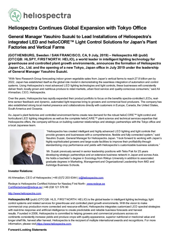 (GOTHENBURG, Sweden / SAN FRANCISCO, CA, 9 July, 2019) – Heliospectra AB (publ) (OTCQB: HLSPY, FIRSTNORTH: HELIO), a world leader in intelligent lighting technology for greenhouse and controlled plant growth environments, announces the formation of Heliospectra Japan Co., Ltd. and the opening of a new Tokyo, Japan office in July 2019 under the leadership of General Manager Yasuhiro Suzuki.