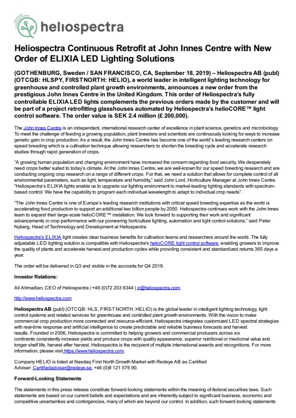 ”The John Innes Centre is one of Europe’s leading research institutions with critical speed breeding expertise as the world is accelerating food production to support an additional two billion people by 2050. Heliospectra continues work with the John Innes team to expand their large-scale helioCORE™ installation. We look forward to supporting their work and significant advancements in crop performance with our pioneering horticulture lighting, automation and light control solutions,” said Peter Nyberg, Head of Technnology and Development at Heliospectra.