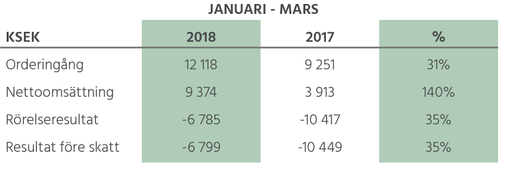 Vårt företag fortsätter att med lyckat resultat verkställa den affärsplan vi tog fram för 2018. Detta har resulterat i både ökad omsättning och en förbättrad kontroll av kapital- och driftskostnader. Detta framgår tydligt av den 140 procentiga försäljningsökning vi uppnått jämfört med samma kvartal föregående år. Orderingången ökade med 31 procent, vilket indikerar större transaktionsstorlekar. Under första kvartalet lyckades vi också förbättra rörelsemarginalen med 35 procent. Detta skedde genom en förbättrad kontroll av driftkostnaderna samt en stärkt position på marknaden. En ökad orderstorlek kan leda till pressade marginaler, vilket vi dock har uppvägt med ökade skalfördelar och förbättrad effektivitet i produktionen.