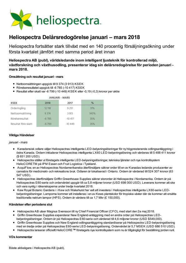 Heliospectra AB (publ), världsledande inom intelligent ljusteknik för kontrollerad miljö, växtforskning och växthusodling, presenterar idag sin delårsredogörelse för perioden januari – mars 2018.