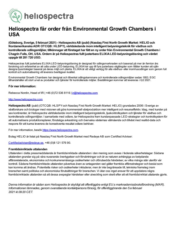Environmental Growth Chambers har designat och tillverkat odlingskammare och kontrollerade odlingsmiljöer sedan 1953. EGC tillhandahåller ett stort urval av produkter och tjänster för kontrollerade miljöer. Beställningen kommer att levereras i Q2 2021.