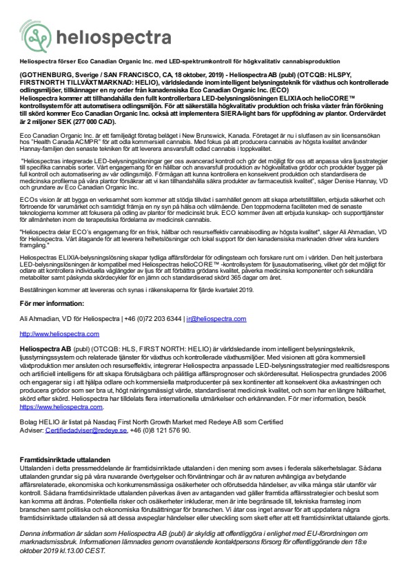 Heliospectra kommer att tillhandahålla den fullt kontrollerbara LED-belysningslösningen ELIXIA och helioCORE™ kontrollsystem för att automatisera odlingsmiljön. För att säkerställa högkvalitativ produktion och friska växter från förökning till skörd kommer Eco Canadian Organic Inc. också att implementera SIERA-light bars för uppfödning av plantor. Ordervärdet är 2 miljoner SEK (277 000 CAD).