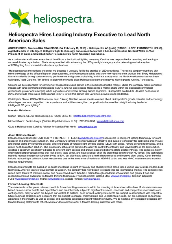 Caroline will be responsible for continuing Heliospectra’s sales growth in the medicinal cannabis market, where the company made significant inroads with large commercial installations in 2015. She will also expand Heliospectra’s market share within the traditional commercial greenhouse grower and emerging urban agriculture and vertical farming market segments. Heliospectra doubled its US sales headcount in 2015 and will add more sales professionals in 2016 to fuel this growth with Caroline’s proven strong leadership.