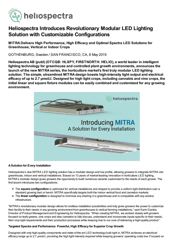 Heliospectra AB (publ) (OTCQB: HLSPY, FIRSTNORTH: HELIO), a world leader in intelligent lighting technology for greenhouse and controlled plant growth environments, announces the launch of the new MITRA series, the horticulture market’s first truly modular LED lighting solution. The simple, streamlined MITRA design boasts high-intensity light output and electrical efficacy of up to 2.7 µmol/J. Designed for high light crops, including cannabis and vine crops, the initial linear and square fixture modules can be easily combined and customized for any growing environment.