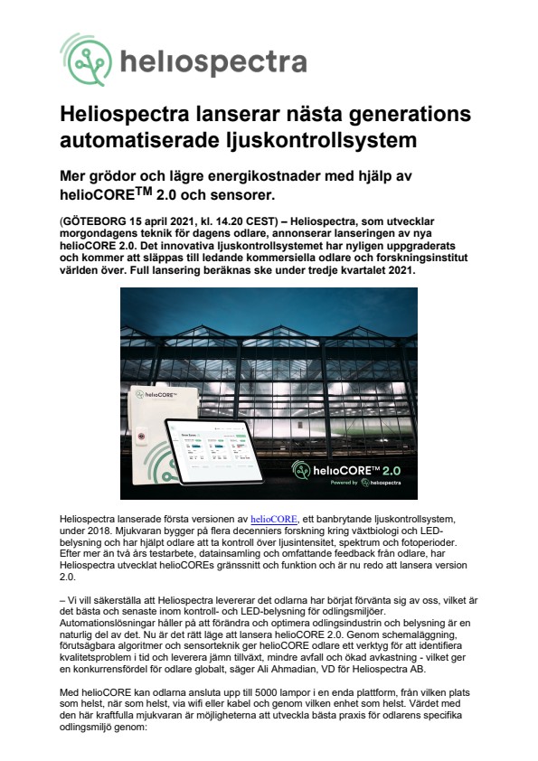 (GÖTEBORG 15 april 2021, kl. 14.20 CEST) – Heliospectra, som utvecklar morgondagens teknik för dagens odlare, annonserar lanseringen av nya helioCORE 2.0. Det innovativa ljuskontrollsystemet har nyligen uppgraderats och kommer att släppas till ledande kommersiella odlare och forskningsinstitut världen över. Full lansering beräknas ske under tredje kvartalet 2021.
