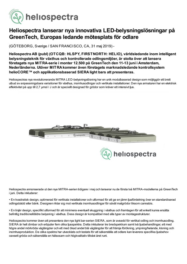 Heliospectra AB (publ) (OTCQB: HLSPY, FIRSTNORTH: HELIO), världsledande inom intelligent belysningsteknik för växthus och kontrollerade odlingsmiljöer, är stolta över att lansera företagets nya MITRA-serie i monter 12.500 på GreenTech den 11-13 juni i Amsterdam, Nederländerna. Utöver MITRA kommer även företagets marknadsledande kontrollsystem helioCORE™ och applikationsbaserad SIERA light bars att presenteras.