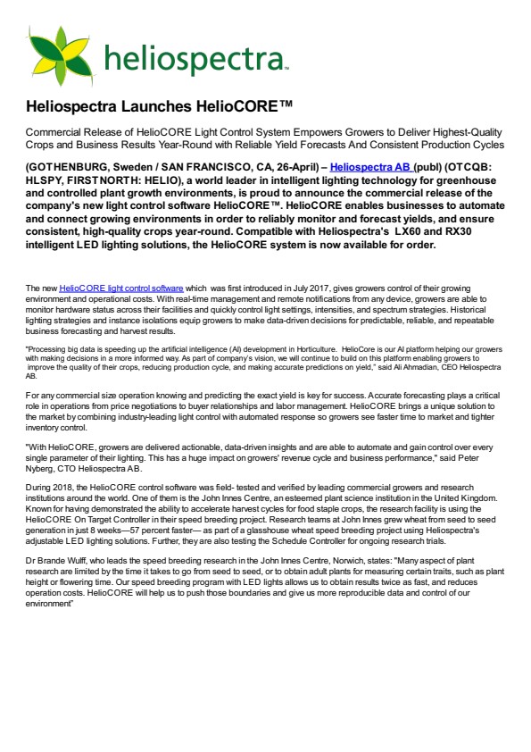 (GOTHENBURG, Sweden / SAN FRANCISCO, CA, 26-April) – Heliospectra AB (https://www.heliospectra.com/)  (https://www.heliospectra.com/)(publ) (OTCQB: HLSPY, FIRSTNORTH: HELIO), a world leader in intelligent lighting technology for greenhouse and controlled plant growth environments, is proud to announce the commercial release of the company’s new light control software HelioCORE™. HelioCORE enables businesses to automate and connect growing environments in order to reliably monitor and forecast yields, and ensure consistent, high-quality crops year-round. Compatible with Heliospectra’s  LX60 and RX30 intelligent LED lighting solutions, the HelioCORE system is now available for order.